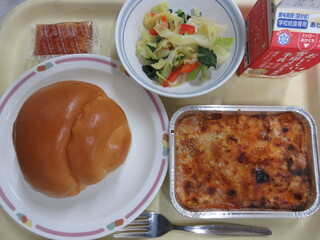 バターロールパン、いちごジャム、焼き豆腐のラザニア、いろどりサラダ、牛乳