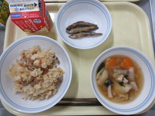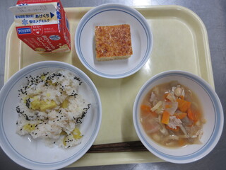 さつま芋ご飯、ツナと長ねぎの卵焼き、豆豚汁、牛乳