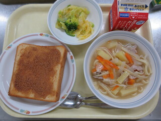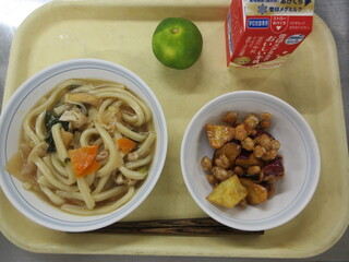 肉野菜うどん、大学芋豆、早生みかん、牛乳