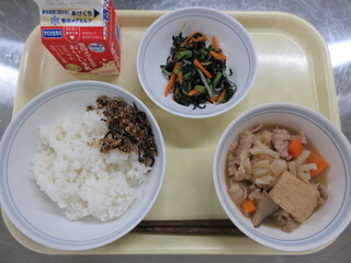 ご飯、骨太ふりかけ、肉豆腐、磯和え、牛乳