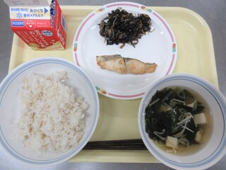 麦ご飯、さわらのごまみそ焼き、ひじきの炒め煮、すまし汁、牛乳