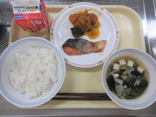 ご飯、さけの照り焼き、かぼちゃのそぼろ煮、すまし汁、牛乳