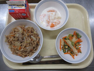 塩焼きそば、じゃが芋ときゅうりの中華あえ、秋のフルーツヨーグルト、牛乳