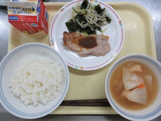 ご飯、豚肉のソテー おろし玉ねぎソース、ねぎ塩レモンサラダ、冬瓜のみそ汁、牛乳