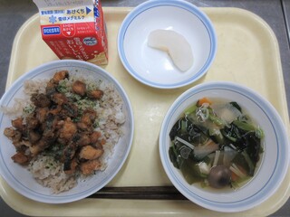 わかめご飯、おから入り卵焼き、おろしポン酢あえ、なめこと油揚げのみそ汁、牛乳