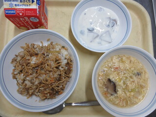 そばめし、卵の中華スープ、りんごのコンポートヨーグルト、牛乳