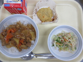 冬野菜の米粉カレーライス、ツナサラダ、スイートポテト、牛乳