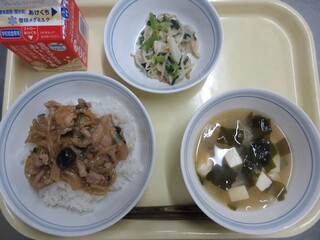 生姜焼き丼、大根とわかめのみそ汁、かまぼこサラダ、牛乳