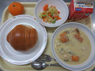 ロールパン、かぼちゃのシチュー、野菜のガーリックソテー、みかん、牛乳