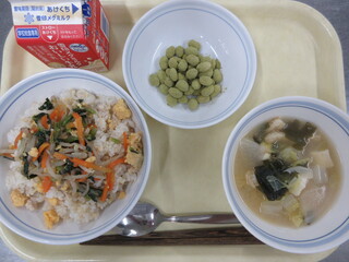三色丼、白菜のみそ汁、カリカリ抹茶きなこ豆、牛乳