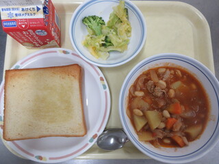 レモンシュガートースト、ポークビーンズ、人参ドレッシングサラダ、牛乳