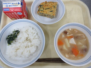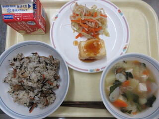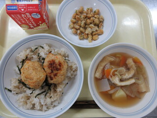 ひじきご飯、揚げだし豆腐、ごまあえ、田舎汁、牛乳