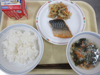 ご飯、さわらのゆず塩焼き、パリパリサラダ、すまし汁、牛乳