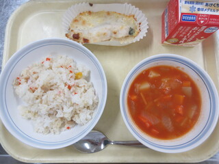 コーンピラフ、ホキのモルネソース焼き、ABCミネストローネスープ、牛乳