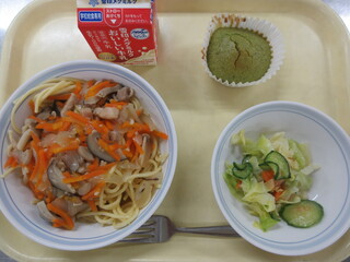 和風スパゲティ、フレンチサラダ、米粉の抹茶ケーキ、牛乳