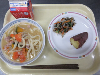 ほうとう風うどん、野菜の磯ゆず和え、焼き芋、牛乳