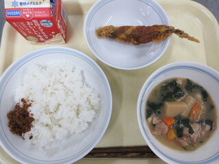 ご飯、おかかふりかけ、ししゃものカレーフライ、治部煮、牛乳