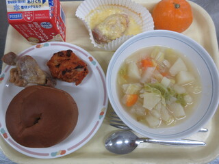ココアパン、チキンのセレクト(タンドリー、ガーリックまたはチーズ)、白菜とじゃが芋のスープ煮、みかん、牛乳