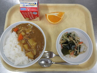 カレーライス、わかめサラダ、ネーブルオレンジ、牛乳