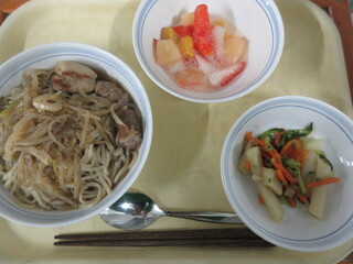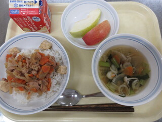 豚すき焼き丼、すまし汁、りんごの食べ比べ(サンふじと星の金貨)、牛乳