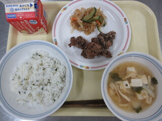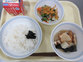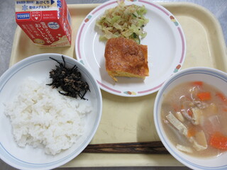 ご飯、ひじき鶏そぼろふりかけ、切干大根入り卵焼き、土佐漬け、豆豚汁、牛乳