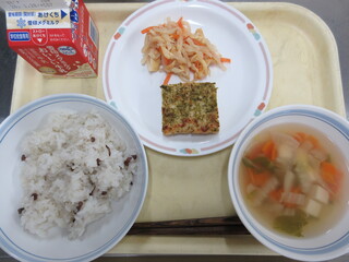 小豆ご飯、松風焼き、紅白ごまなます、七草汁、牛乳