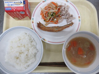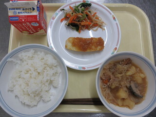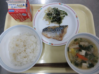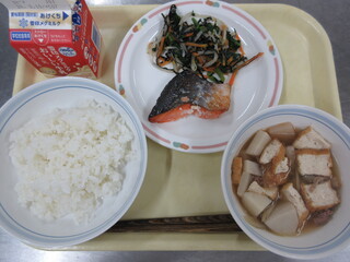 ご飯、さけの塩焼き、磯和え、芋煮、牛乳
