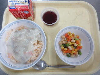 チキンクリームライス、ビーンズサラダ、ぶどうゼリー、牛乳