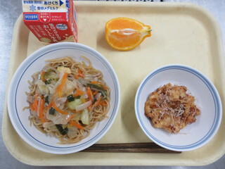 馬三ラーメン、じゃがいもときゅうりの中華和え、フルーツポンチ、牛乳