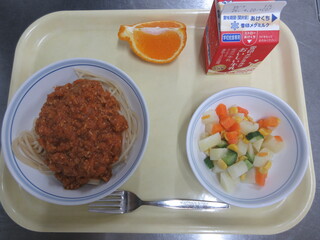 スパゲティ みそミートソース、マセドアンサラダ、デコポン、牛乳