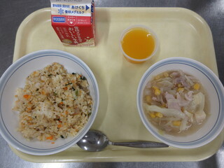 チャーハン、豚肉と豆腐の中華スープ、みかんゼリー、牛乳