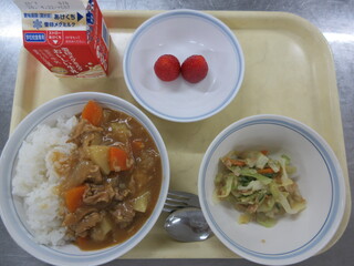米粉のカレーライス、ツナサラダ、いちご、牛乳
