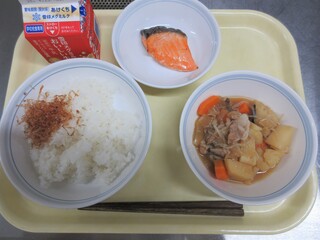 ご飯、おかかふりかけ、さけの塩焼き、肉じゃが煮、牛乳