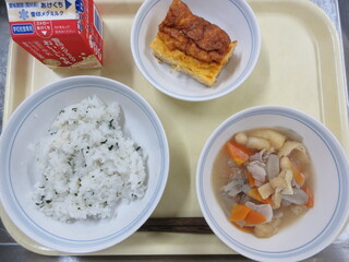 わかめご飯、切干大根入り卵焼き、豆豚汁、牛乳