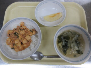 マーボー丼、わかめスープ、りんご