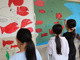 既存校舎の取り壊しに当たり、こどもたちが感謝の気持ちを込めて、校舎にペイントをしています。