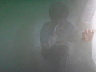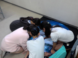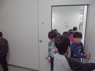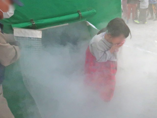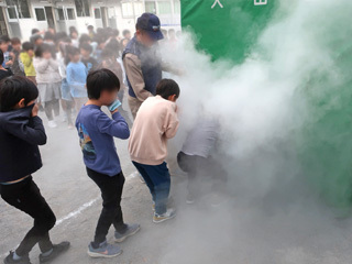 火災時に煙によって視界が奪われることを害のない煙で再現し、避難を体験しました。