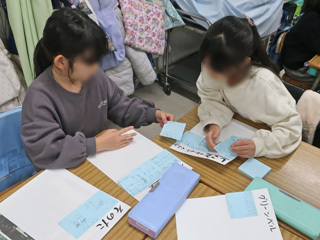 付箋を机に広げ、「仕事内容や工夫」「人の気持ち」「その他」に分類し、「人の気持ち」を中心に質問を考えて発表しました。