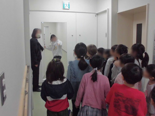 朝の時間に防火扉を実際に閉め、通り方を指導しました。