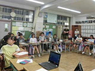 偶数学年が体育館に入り、奇数学年は教室でオンラインでの参加です。