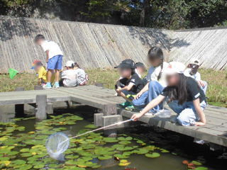 睡蓮の花が咲く水生植物園では、ザリガニ、メダカ、オタマジャクシなどを見つけました。