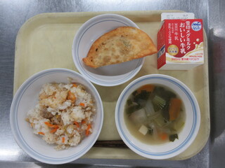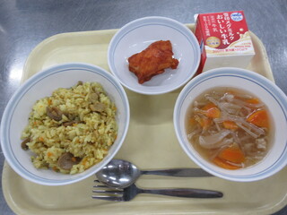 献立:カレーピラフ ヤムニョムチキン 春雨スープ 牛乳