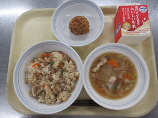 献立:きんぴらごはん のっぺい汁 ごま団子 牛乳