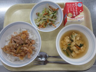 献立:豚キムチ丼 かみかみサラダ にらたまスープ 牛乳