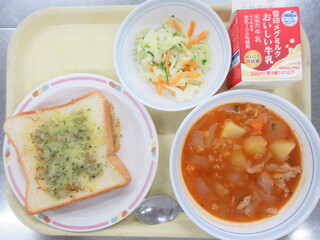 献立:じゃこチーズトースト コールスローサラダ レンズまめのシチュー 牛乳