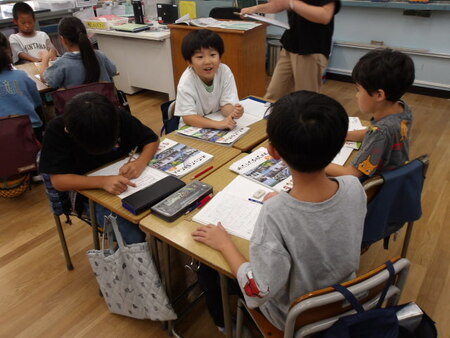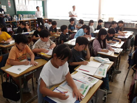 1校時の3年生の教室です。社会科の学習をしています。交通事故を防ぐという単元です。大田区の人口の推移と交通事故の推移のグラフを見ながら、交通事故が減ってきているのは、多くの人の工夫や努力があるのではないか?という課題をたて、今後の学習につなげていっています。