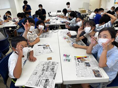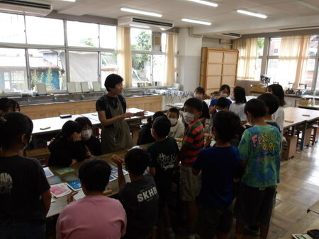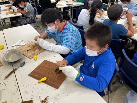 3校時の図工室です。5年生が、図工の学習をしています。版画の学習です。一度彫った版画を刷り、また、版画を彫り進め、刷った絵に重ねていくという教材です。彫り進めていくうちに、版画の模様や色が重ね合わさって、きれいな版画になっています。一人一人が思い思いの作品作りをしていてすてきな作品になってきています。