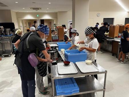 2日目の夕食の時間です。こどもたちも元気で美味しく夕食をいただいています。昨日と同じでみんなよく食べています。みんなと一緒の時間は、楽しそうですが、こどもたちと話していると、ちょっとホームシックになっている子もいるのかな?