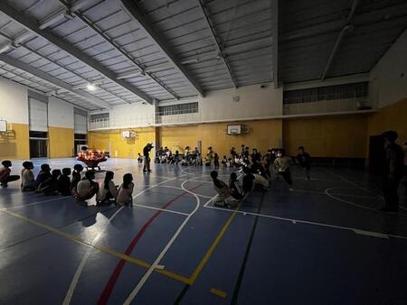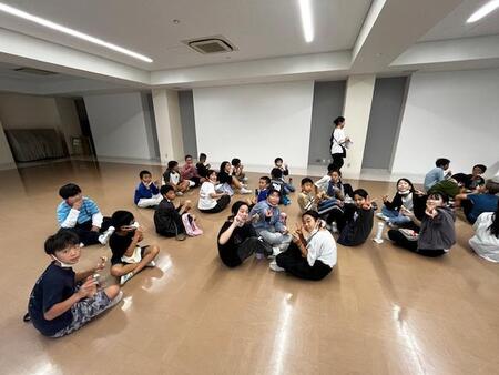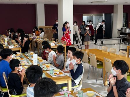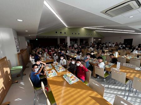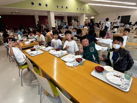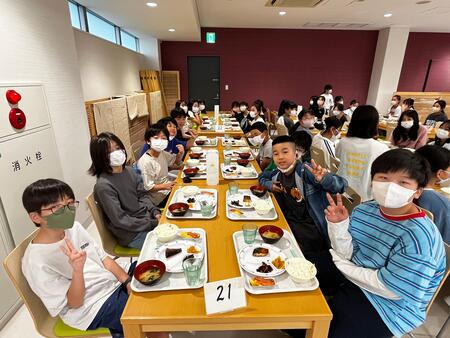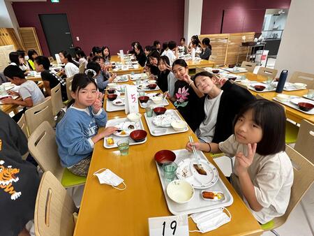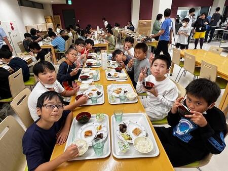 夕食の時間です。いただきますの前に一緒に宿泊する大森第四小学校のこどもたちと顔合わせ式を行いました。両校そろっていただきますをして、食事が始まりました。大きな声を出さずに静かに食べています。お代わりをする子も多く、残り物はありませんでした。ほとんどの子が完食していました。たくさん歩いたのでおなかもすいたことでしょう。