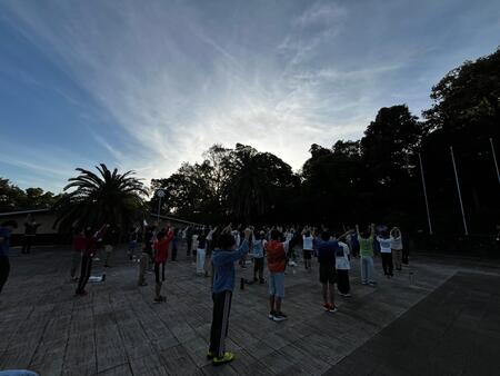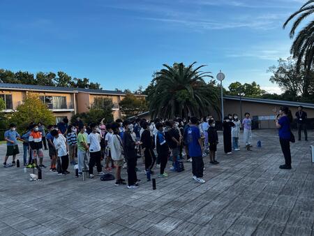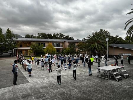 移動教室2日目の朝を迎えました。昨晩はみんなよく眠れたようです。広場で、ラジオ体操をした後に朝会をしています。現在、発熱等具合の悪い子はいません。今日は午前中にカレー作り、午後は木のスプーン作りをします。楽しい体験活動になりそうです。